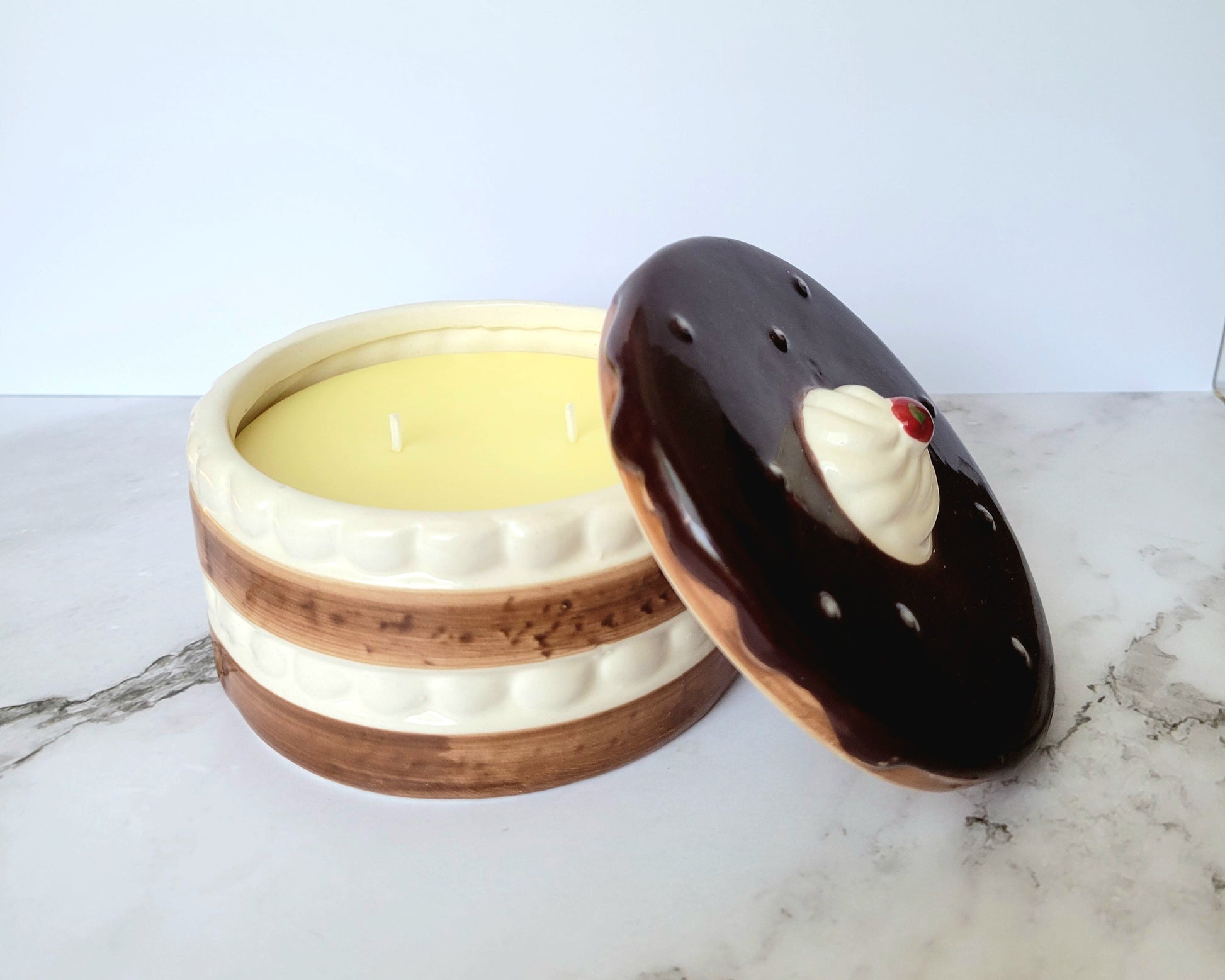 Our best-selling Warm Welcome now comes in a larger, one-of-a-kind container with a double wick. Shaped like a cake with a cherry on top, these limited time containers are meant to bring twice the joy that our regular candles bring.